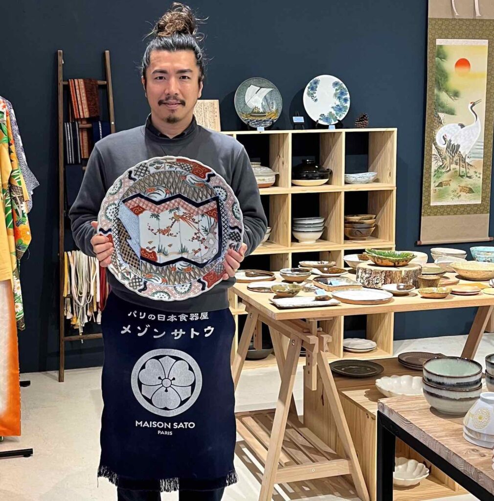 Créée à Paris en 2019, Maison Sato est spécialisée dans la vente de céramiques et objets de décoration importés du Japon. Son fondateur, Atsushi Sato, a commencé son activité en organisant des pop-up stores, mais depuis 2022, il est installé dans une très belle boutique de la rue de Thorigny, en plein Marais (Paris 3e). Vous y trouverez aussi bien des bols, des tasses, des assiettes, des plats de style contemporain ou vintage, ainsi que des porte-baguettes, des boîtes à thé (natsume) anciennes en bois laqué, des kakejiku (peinture ou calligraphie sur soie ou papier en rouleau suspendu), des kimonos, de vieux vinyles de jazz et de pop japonaise…
