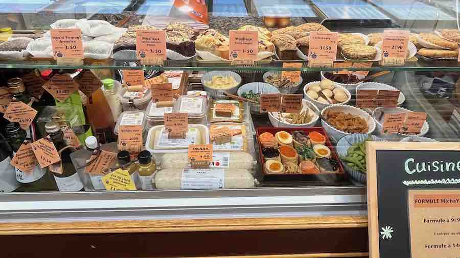 En plus de son épicerie, Micha-Ya propose un espace traiteur où l’on peut déguster sur place (une dizaine de places assises) ou acheter des plats cuisinés à emporter, inspirés de la cuisine familiale japonaise et préparés avec des ingrédients frais du marché et des produits importés du Japon. Parmi les spécialités, on retrouve des onigiri garnis au thon mayo, au saumon ou aux légumes marinés (entre 3,50 € et 5,90 €), des inarizushi (entre 3,90 € et 4,90 €), des bento complets (de 9 € à 16,50 €), du curry japonais (entre 9 € et 13 €), et des udon (à partir de 9 €). L’offre inclut également des desserts, comme des mochi aux saveurs variées, des cookies au matcha et au chocolat blanc, ou encore un délicieux carrot cake.