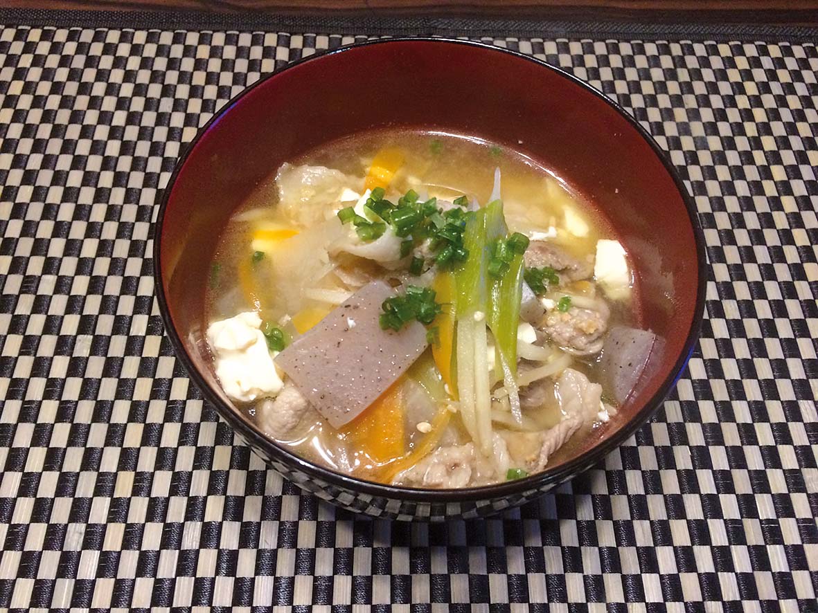 Préparation : 1 - Dans une casserole, chauffer l’huile de sésame puis faire sauter le porc. 2 - Quand le porc change de couleur, ajouter les légumes. 3 - Ajouter le konnyaku et le tofu 4 - Ajouter tout de suite le dashi. 5 - Laisser mijoter pendant 10 minutes environ. Puis ajouter le miso. 6 - Servir....